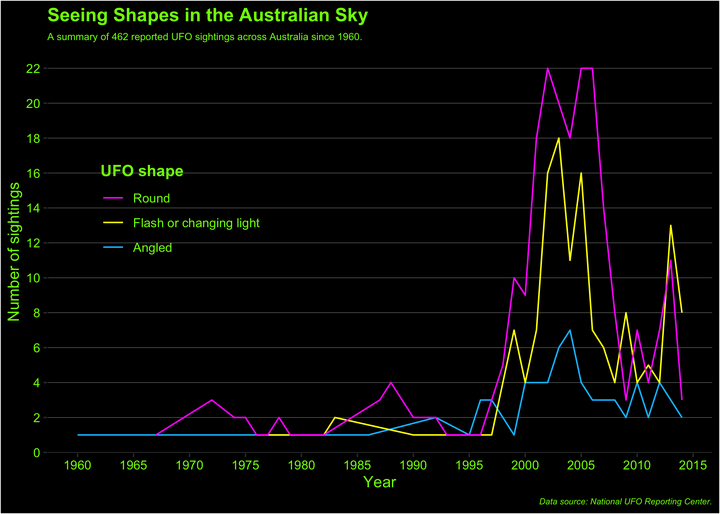 This week’s Tidy Tuesday data comes from NUFORC and includes more than 80,000 recorded UFO sightings around the world. I had a lot of fun with this, especially reading some of the descriptions from reported sightings in Australia: